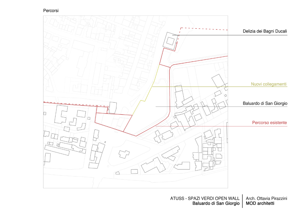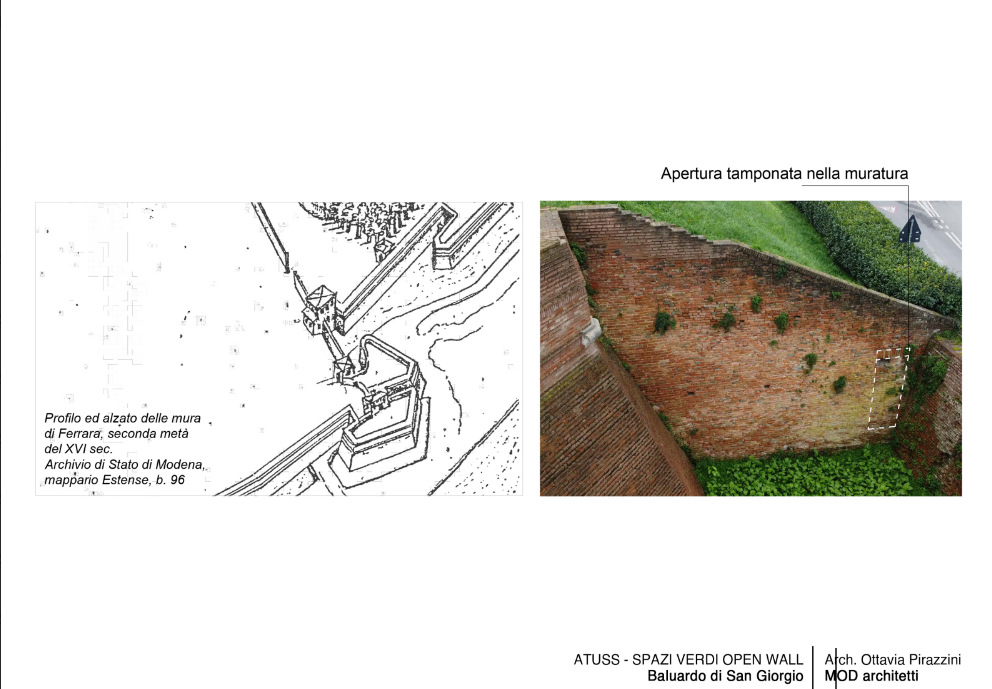 “Il progetto Baluardi - San Giorgio - dell’Amore ridarà vita all’antico passaggio che storicamente collegava San Giorgio ai Bagni Ducali. Si tratta di una riqualificazione paesaggistica, che contribuisce a valorizzare il rapporto tra la città, le sue mura storiche e il vallo attraverso di esse”, specificano i progettisti Massimo Partigiani e Ottavia Pirazzini. “Punto di partenza di un nuovo percorso ciclopedonale sarà la riproposizione di un tracciato storico, già presente nel 16° secolo, ovvero la porta del Barbacane, che permetteva il passaggio dalla città al vallo e che permetterà ora il passaggio da viale Alfonso I d’Este ai Bagni ducali”. Nello specifico, “verrà aperto un varco nelle mura, con la realizzazione di un percorso con una pedana di legno di 90 metri lineari di lunghezza e una pendenza contenuta, protetta dalla strada dove ve ne sarà bisogno, che collegherà di nuovo San Giorgio alle mura e al sopramura sud-est”, concludono Partigiani e Pirazzini.