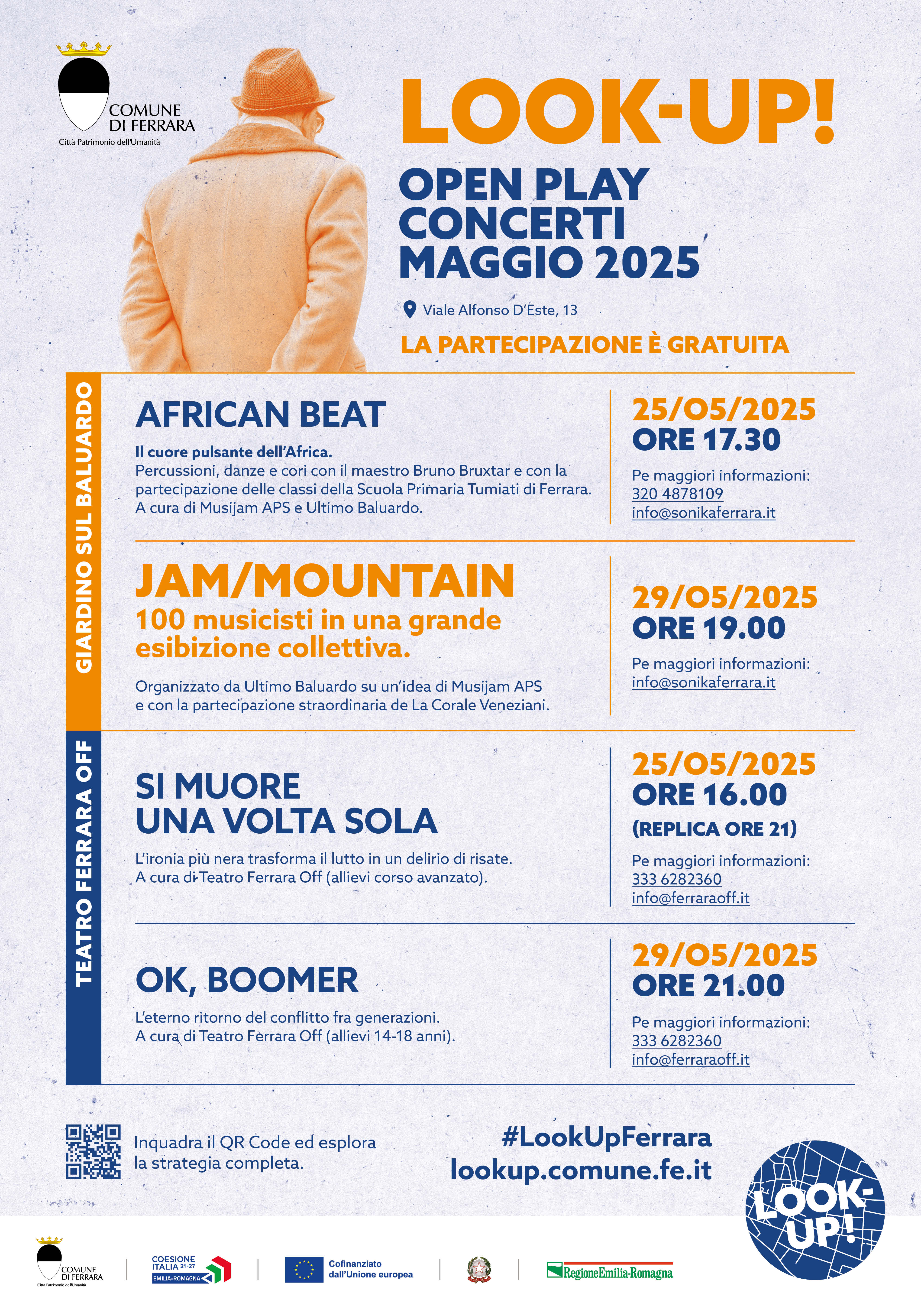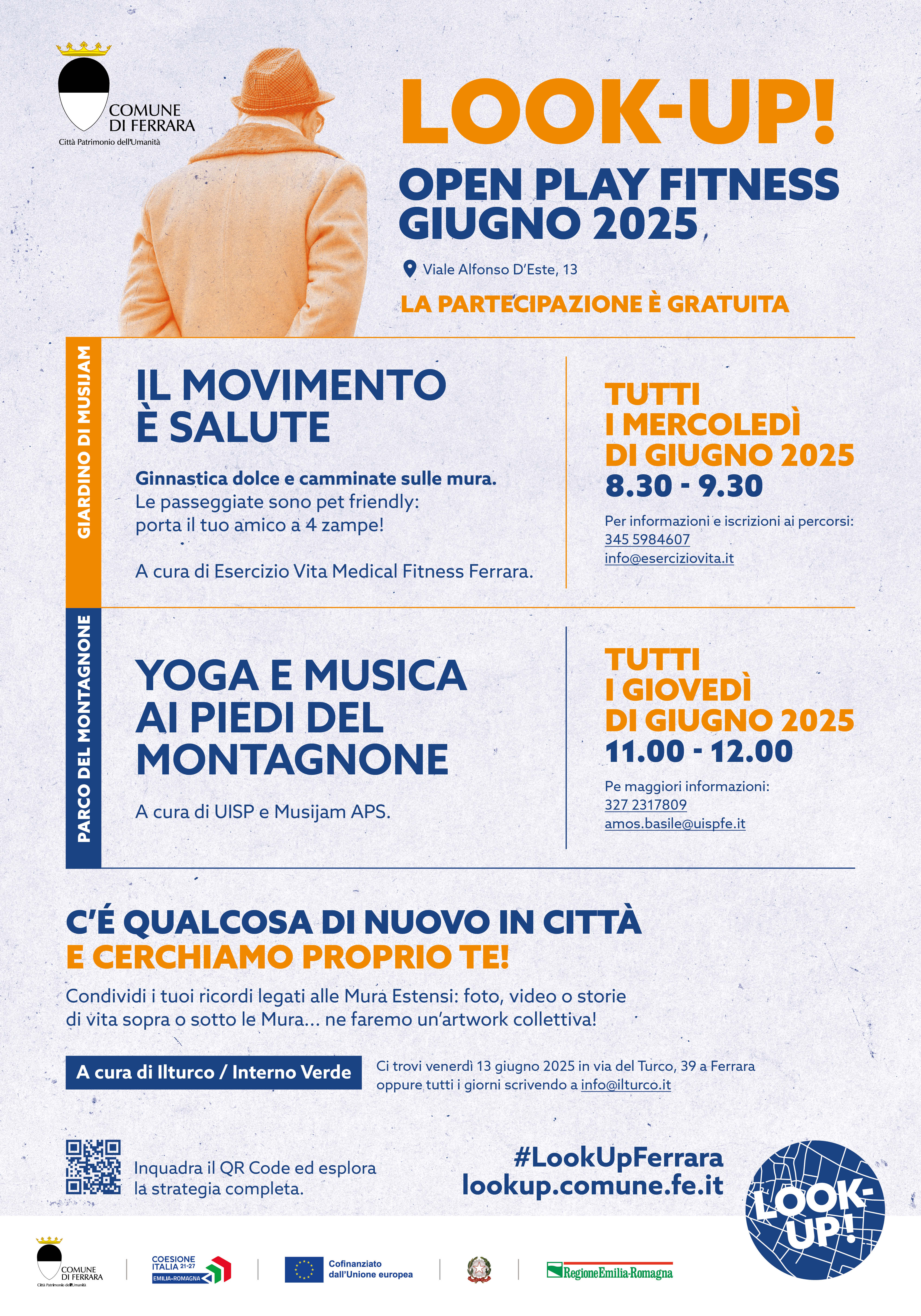 Di seguito il calendario eventi, l'insieme dei progetti di riqualificazione Look Up! Atuss Ferrara e, in sintesi, le tappe e i protagonisti del percorso partecipato.